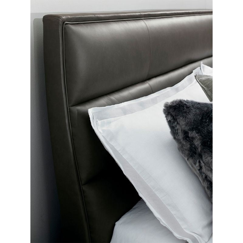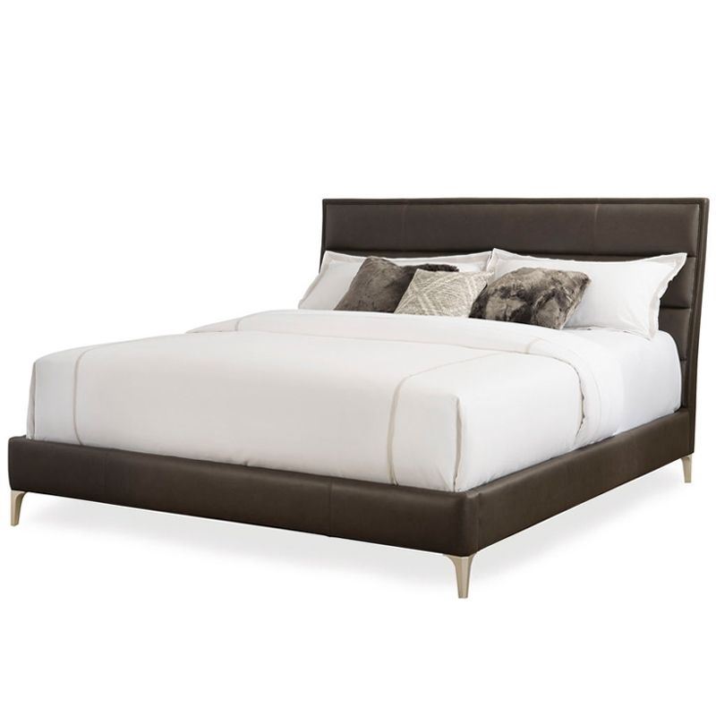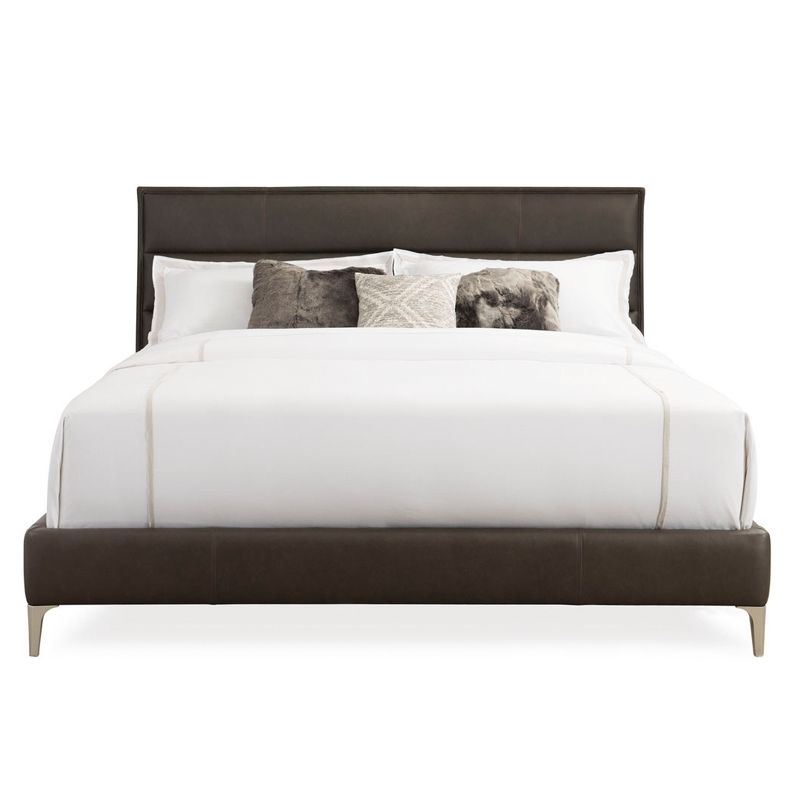 Leather beds instantly add a touch of luxury to a bedroom. This handsome piece has deep horizontal channels of sumptuous charcoal grey-colored leather that run along the headboard, across the rails and around the low footboard. Resting atop sculpted trapezoidal metallic jazzy taupe feet, this bed's streamlined appeal is dapper indeed.