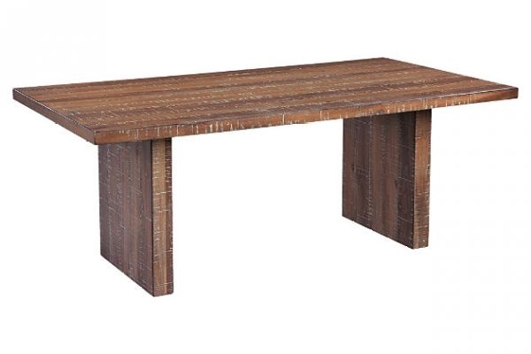Heavily distressed acacia veneers and hardwoods boldly display saw marks resembling reclaimed lumber, while an antique white glaze finish subtly showcases the richness of the grain