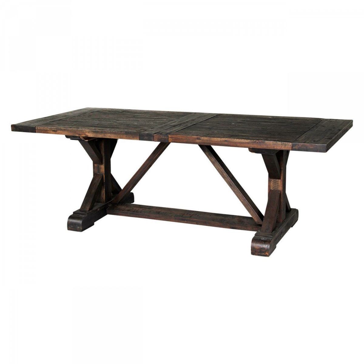 Featuring plank effect, hand-worked solid acacia wood and canted tubular metal pedestals, this dining room table has a simple modern rustic appeal. The distressed details offer instant character with exotic intrigue.